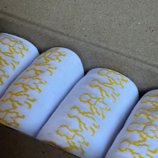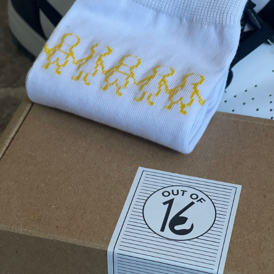 Each Out of Sixteen box includes a set of 4 uniquely designed socks, packaged in a 100% recyclable cardboard and foam box. Our packaging is thoughtfully created with sustainability in mind, featuring positive motivational stickers and inspiring quotes. The box is secured with a white sticker bearing the Out of Sixteen logo to ensure safety and protection of the product.