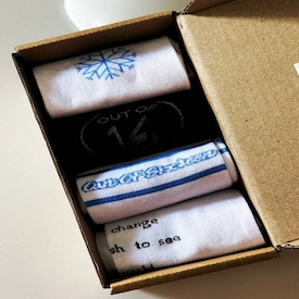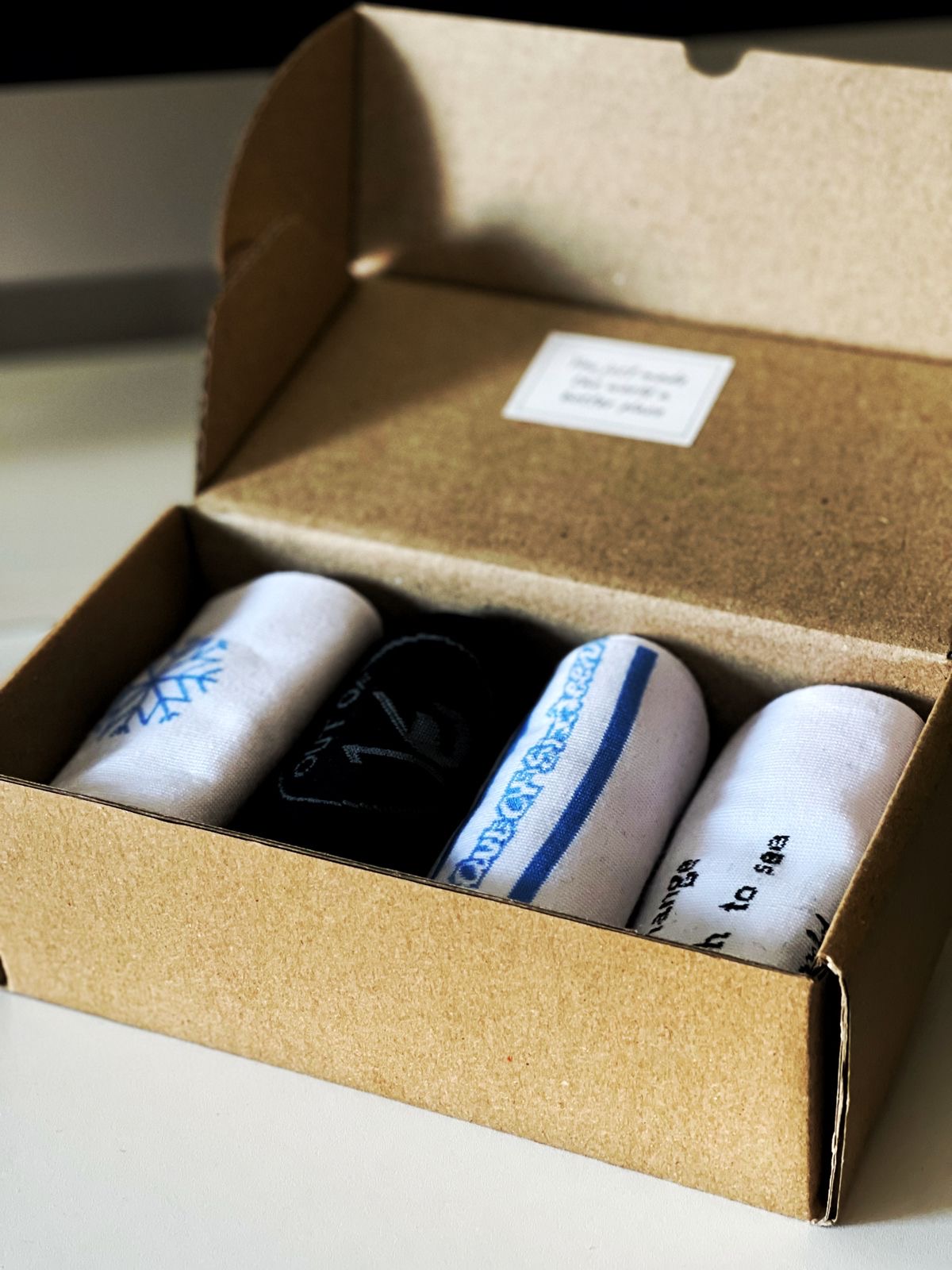 The socks come in a 100% recyclable box, featuring motivational stickers and the Out of Sixteen logo for a thoughtful, eco-friendly unboxing experience.